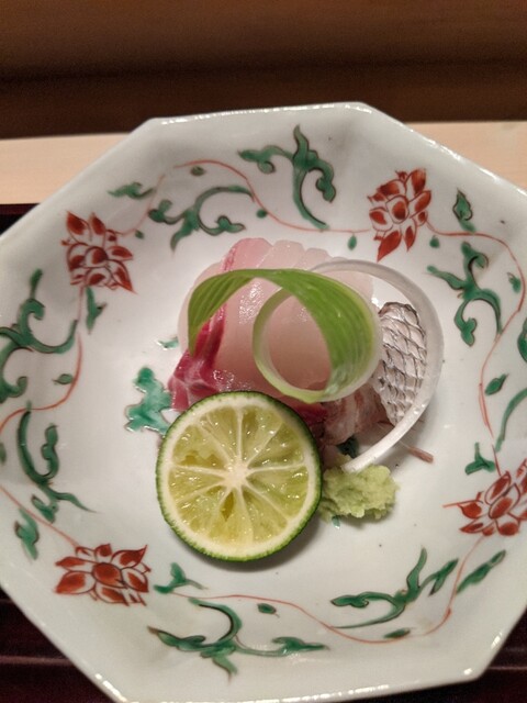 椀物は花咲蟹のしんじょうと冬瓜。出汁の香りが立ち、優しく深みのある味わい。お造りは藁で炙ったヨコワ(鮪の幼魚)と、プリプリと弾力のあるめいちだい。噛むごとに旨味があふれます。