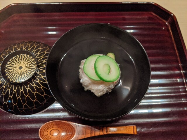 ふんわり揚げた飛竜頭に、枝豆のほくほく感と蓮根のシャキシャキ感を忍ばせた椀物。やさしい出汁に浸して供され、食感とじんわり広がる旨味が良かったです。
