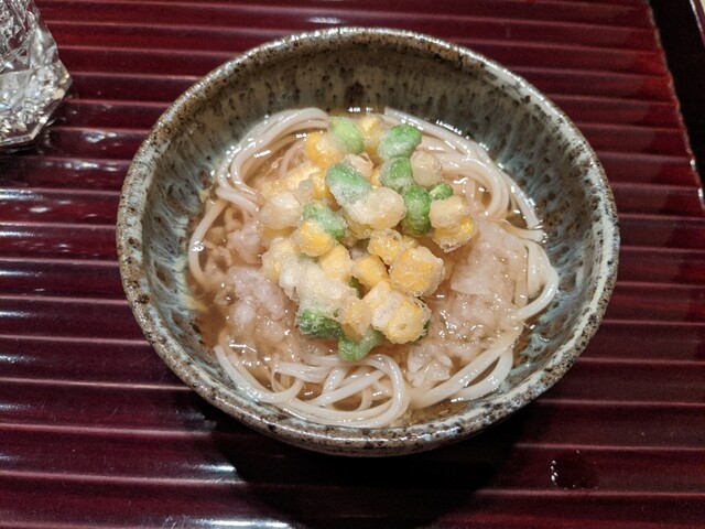 賀茂なすと鴨肉はお浸し仕立て。出汁の優しさが光ります。鮎の塩焼きは定番ながら、丁寧な焼きで身はふっくら。枝豆ととうもろこしのかき揚げは香ばしく、そうめんと合わせて。