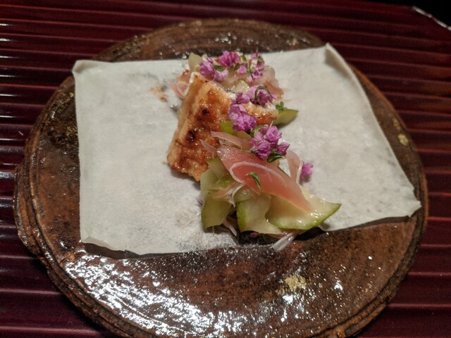 今回も昼の訪問。ランチ派なので、昼に夜と同じコースが食べられるのは有り難いです。炭焼き台を中心に据えた直線カウンター、静かで凛とした空間は変わらず。亭主と若手2名の息の合った所作は、今回も料理への期待を高めてくれます。