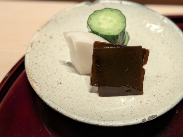 海老はぷりぷりで甘みしっかり。柿や椎茸などの具材も良いバランスで、みぞれあんとの相性が良く、非常に美味しい先付けでした。
