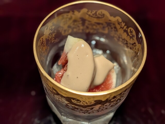 無花果に濃厚な胡麻ダレを合わせた小鉢。果実の甘さと胡麻の香ばしさが不思議な調和を見せ、和え物のようでもありデザートのような一品でした。