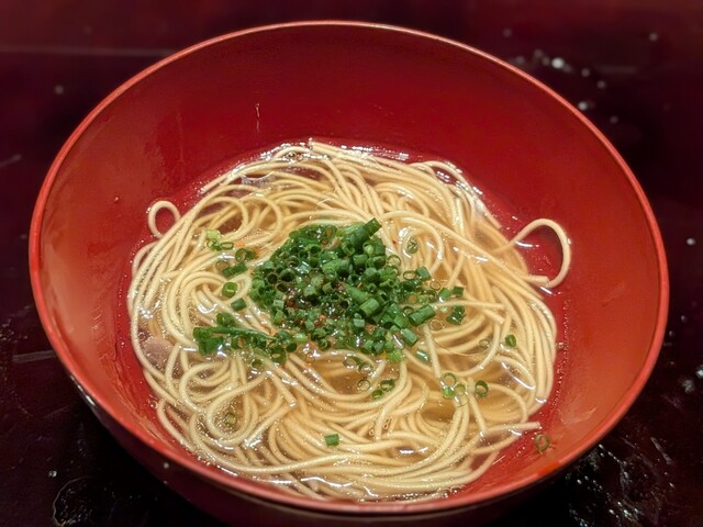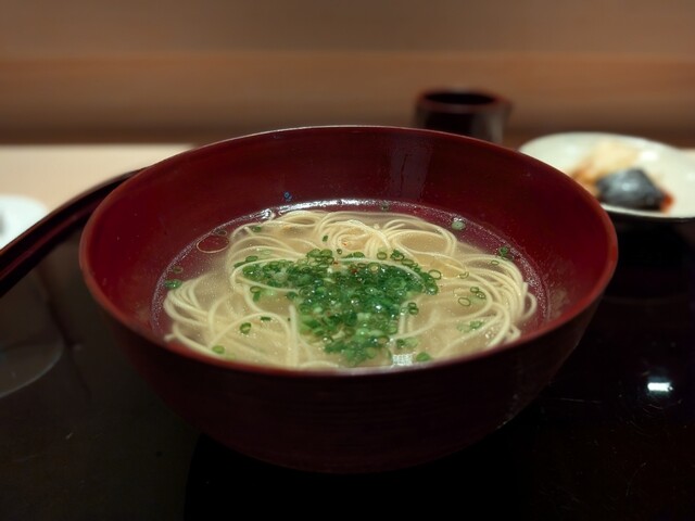 透き通ったスープはフカヒレの旨みを丁寧に抽出したもの。和出汁のように澄んだ味わいながら、ほんのり中華のニュアンスがあり独特の奥行きがあります。お腹いっぱいでしたが、細麺がつるりと入っていきますね。