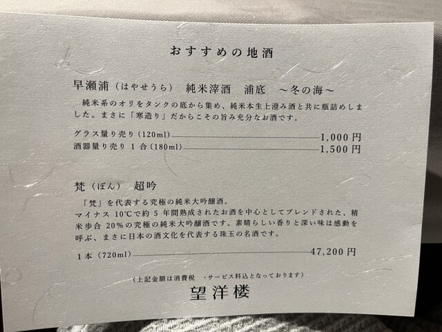 お酒は日本酒を何銘柄かいただきました。どのお酒も料理に合っていたと思います。