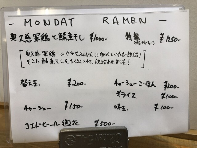 月曜日は、MONDAY RAMENのみの提供とのこと。この日は、「奥久慈軍鶏と鯖煮干し」でした。