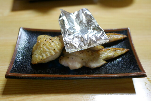 日本酒のお代わりを呑んでいると、これくらいしか無いけどと「肝焼き」と「エラ焼き」を小鉢で