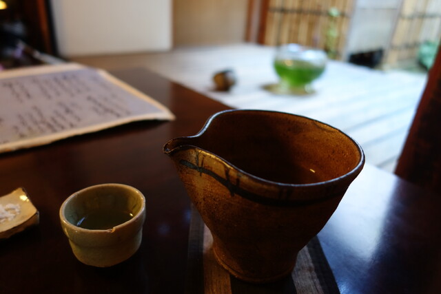 日本酒は趣のある器に入れられ、揚げ蕎麦と山葵の醤油漬けがお通しとして出されました。