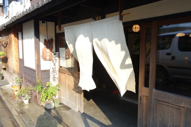 玄関の引き戸は開け放たれ白い暖簾が床近くまで垂れ下がっています。