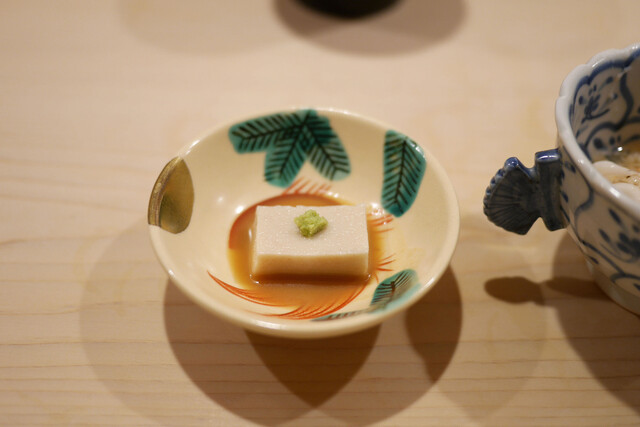 ・「壬生菜と湯葉」貝柱の出汁、「胡麻豆腐ピーナッツソース掛け」