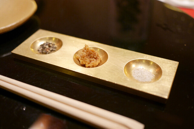 ソース、藻塩、西洋山葵、トリュフ塩からお好みを付けて頂きます。