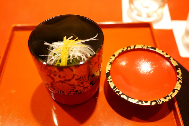 ・「先付」・・・牛肉骨のスープ、三つ葉、焼麩入り