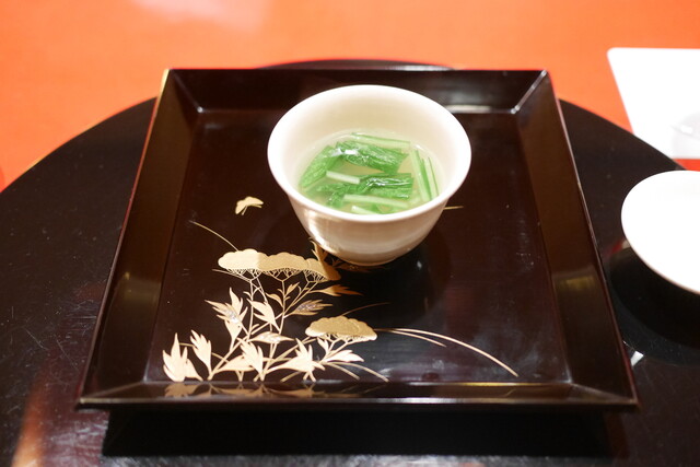 ・「先付」・・・鰹と牛肉骨のスープ、壬生菜