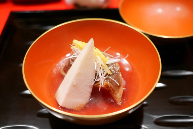 ・「椀物」海老芋と聖護院大根、腹身、白髪葱、柚子