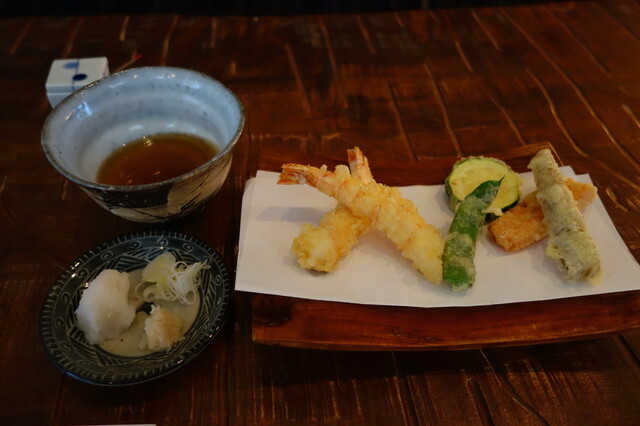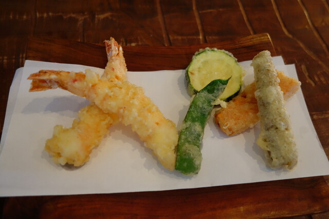 「天ぷら」は海老2匹、ズッキーニ、人参、牛蒡、隠元でした。