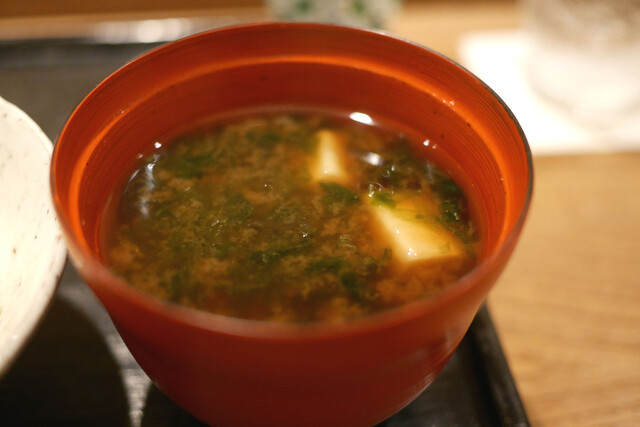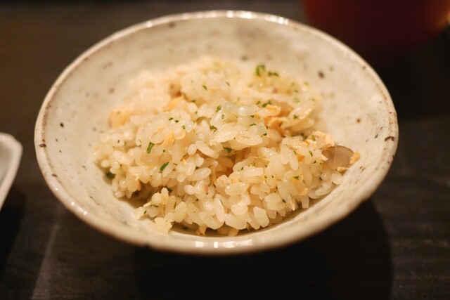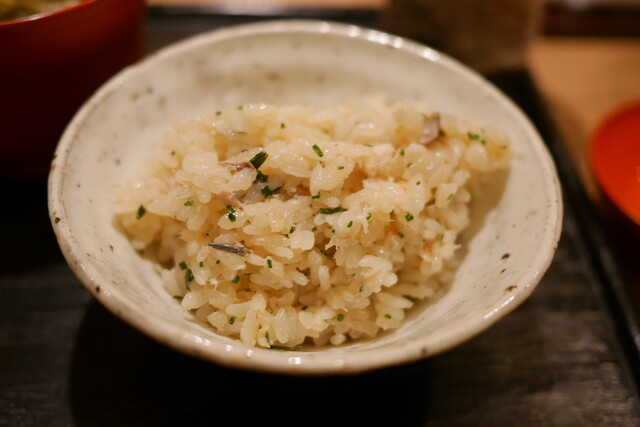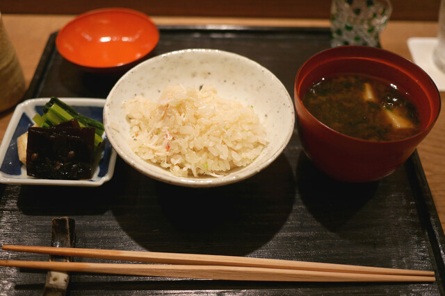飯物「帆立貝柱の炊込み御飯」止め椀「アオサの味噌汁」 2015年2月