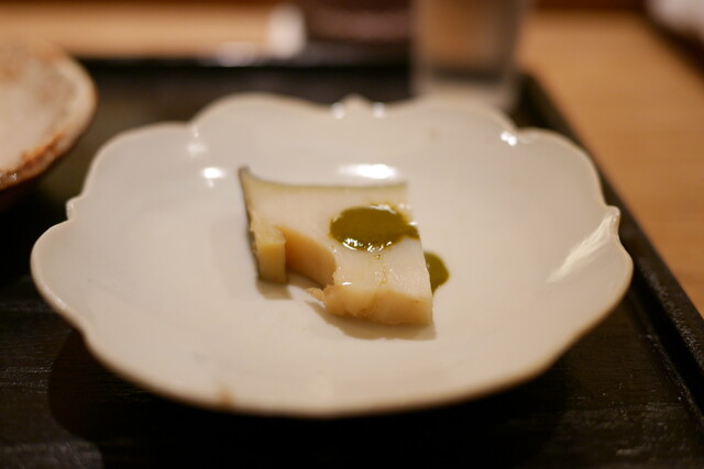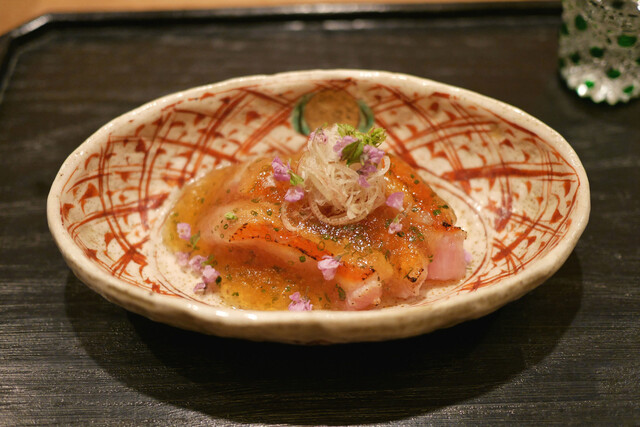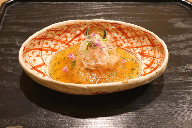 「先付」喉黒の皮目藁焼き、芋茎、鰹出汁と橙のジュレ掛け