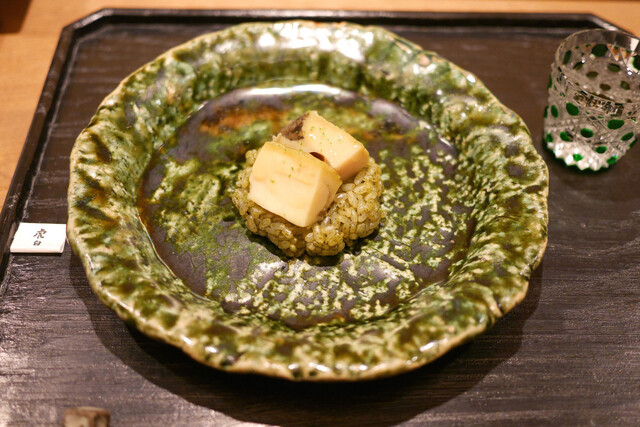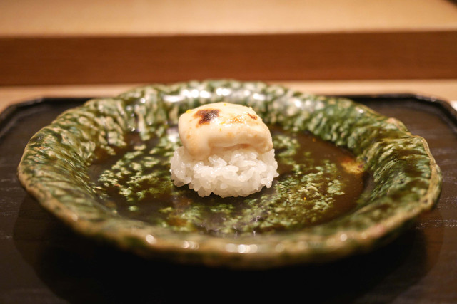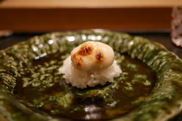 「凌ぎ」鮑の蒸し煮、餅米、肝の裏ごしソース