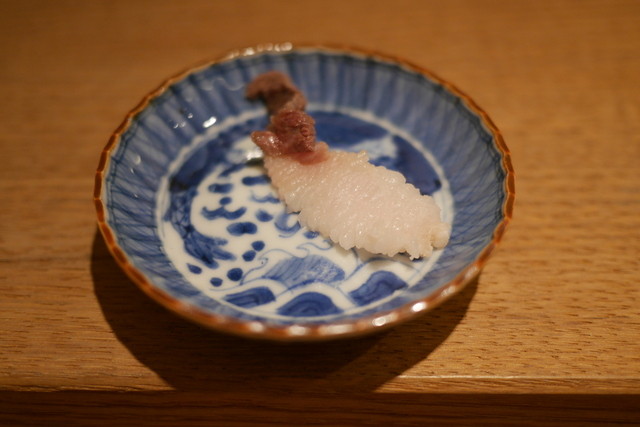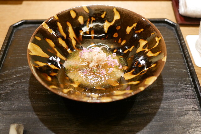 蒸鮑、葛切り、酸味のある肝ソース 2016年5月