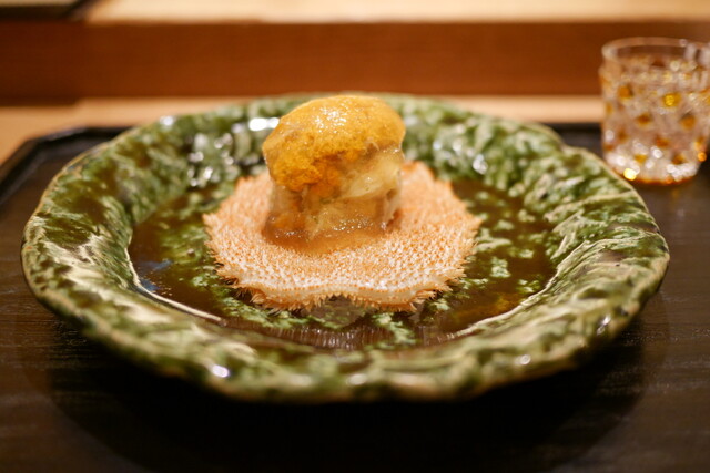 「先付」・・・蒸し鮑の素麺、海胆乗せ、レモンジュレ
