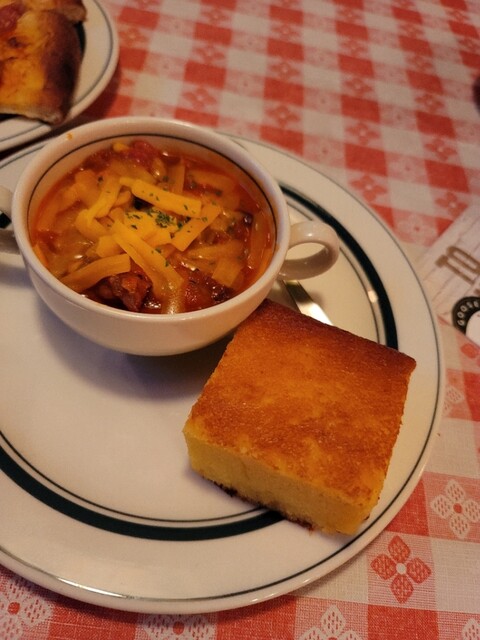 トッピングでチーズ、付け合わせにコーンブレッドも頂きましたがこのコーンブレッドが絶品。