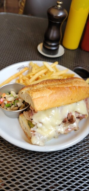 Georgia caviar(ブラックアイドビーン、野菜のディップ。アメリカ南部料理)が添えられた週替わりスペシャルは手作りハムのサンドイッチ。