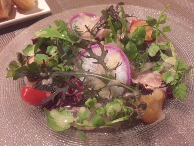 2皿目は、ブリの燻製サラダ。なかなかジューシーですが、フレッシュ野菜が軽く