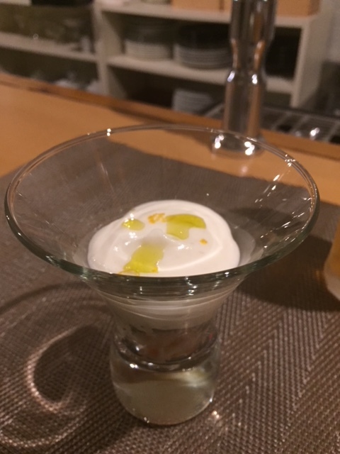 一皿目はカリフラワーのムース~コンソメジュレのせをいただきました。