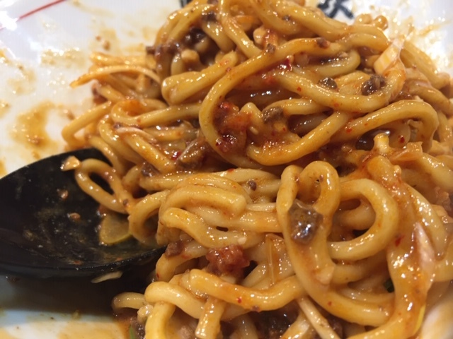 登場した汁なし担々麺は、甜面醤の割合が多いのか肉味噌が黒い!
