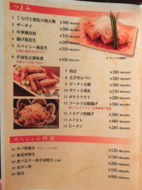 「メニュー(おつまみ)」串焼きは\160~、おつまみは\280~