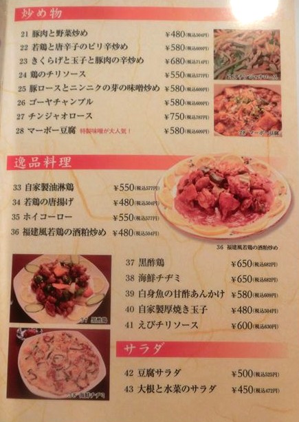 「メニュー(炒め物、逸品料理、サラダ)」:「黒酢鶏」がオススメ♪