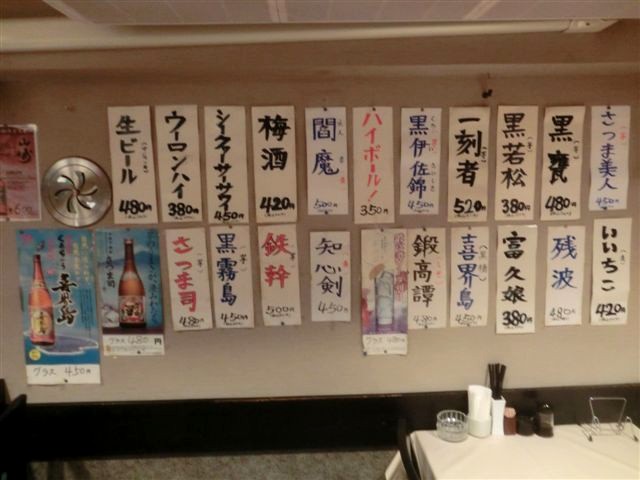 日本酒(高清水、一ノ蔵、真澄、八海山)、焼酎(黒甕、一刻者、閻魔、鉄幹、喜界島、霧島、いいちこ)