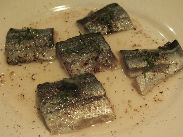 「軽くあぶったサンマのマリネ」:バーナーで炙っているから、