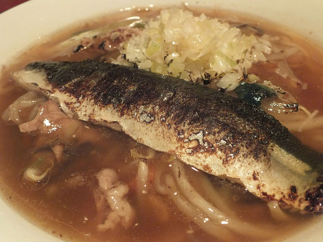 「サンマをトッピングした 生碼(サンマー)麺」:シャレから始まったメニューw サンマのマリネを旨みたっぷりな餡が包んで甘酸っぱいコクが、トローンと!意外と合う♪