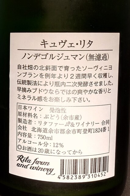 自社畑の北斜面で育ったソーヴィニヨンブランを例年より2週間早く収穫し、伝統製法により瓶内二次発酵させた。早摘みブドウならではの爽やかな香りとミネラル感。デゴルジュマンはワインを逆さまにしておいて澱を瓶の口の方に集めて抜栓し澱を抜くこと。ノンデゴルジュは澱を抜いていない。