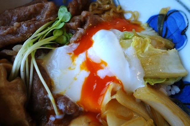 底の浅い大きめの丼を見ると、すき焼き牛肉が半分以上占める。