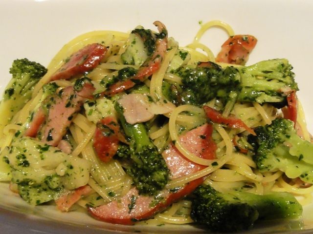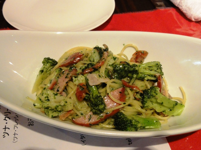 パスタも選べます。ブロッコリーとベーコンのほうれん草のグリーンソースをお願いします。