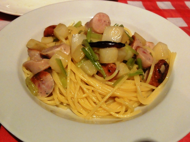 ソーセージとカブの塩味パスタ