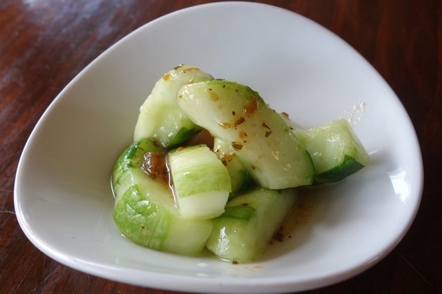 サラダと格闘しているとサービスですと瓜の漬物が出される。