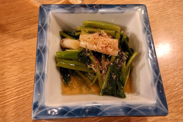 最後に野菜を頼んでしまうのもオッサンの性(サガ)。菜の花の苦味と出汁の滋味深さで日本酒がススム。多分ナッツよりもこっちが正解。