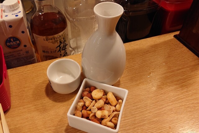 次は日本酒。特に銘柄も指定しない2合700円の気兼ねなく飲めるヤツ。合わせるのは何故かミックスナッツ。ドライフルーツよりは日本酒に合うような希ガス。
