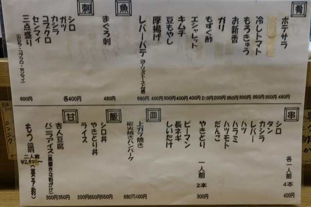 のんきといえばシロタレは外せない。焼き物は4本からだが、2本ずつ違う種類を焼くハーフ盛も可能。シロは記憶どおりの軟らかさで甘めのタレにベストマッチ。カシラは程よい火入れでジューシー。