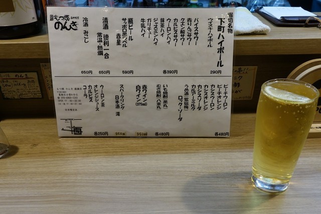 言わずと知れたのんきのボール。焼酎をソーダで割り下町エキスで色付けしレモンスライスの風味をプラス。もつ焼き片手にボールで決まり。2016年のレビューを見たら値段が変わってない~マーヴェラス!氷で誤魔化さない下町ハイボール。アルコールは強めだが口あたりが良いので飲みすぎ注意である。お通しはキュウリ漬け。亀有の江戸っ子のボールが400円に値上がりしているので、お通しくらいはOKだ。