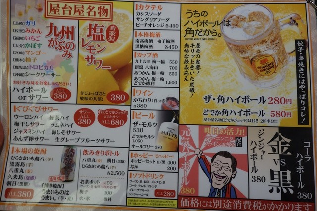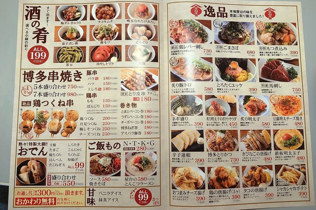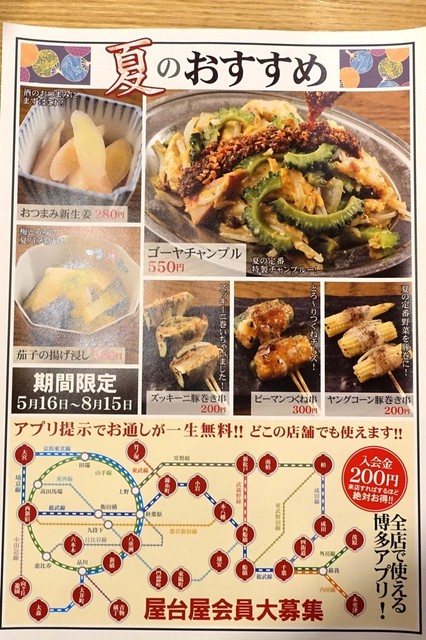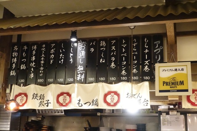のれんをくぐれば、そこには昔懐かしいあったか空間が広る。名物鉄鍋餃子・博多串焼き・鉄板焼き・おでん・もつ鍋などの安くて旨い屋台飯に、ビール・爽快ハイボール・厳選九州の焼酎・地酒などを提供する。