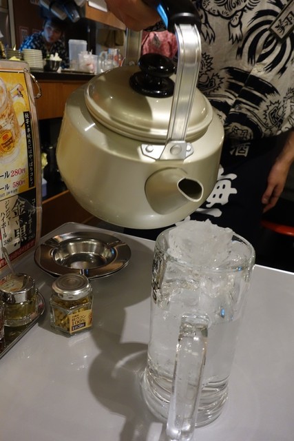 お通しはお代わりOKの塩昆布キャベツ。以前はホッピーセットの焼酎は定量だったのだが、今はストップと言うまで焼酎を注いでくれる。もちろん中も同様なので安く飲むならホッピー一択。メガジョッキ変更は会員特典で無料。そして、お通しも無料。