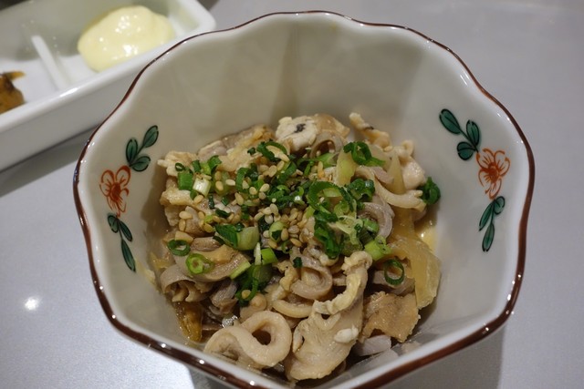 お通しはお代わりOKの塩昆布キャベツ。以前はホッピーセットの焼酎は定量だったのだが、今はストップと言うまで焼酎を注いでくれる。もちろん中も同様なので安く飲むならホッピー一択。メガジョッキも会員特典で無料だけど、氷が多くて持て余すのだ。