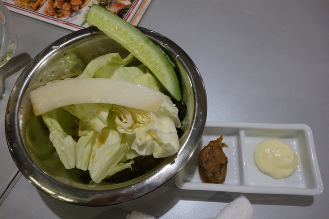 お通しはキャベツ、キュウリ、大根にマヨネーズと味噌が付く。