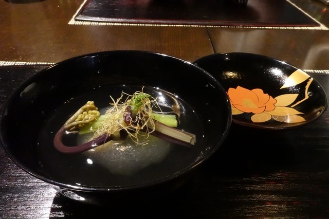 コンニャク、貝付きのベビー帆立、お麩、そら豆、肉巻き、百合根、ホタルイカ、海老、こごみが春らしい。これに鴨肉と出汁巻き玉子が加わる。