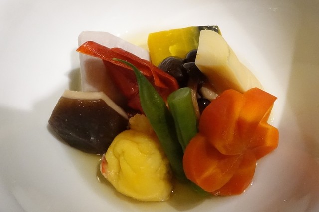 タラバガニつくも煮のヤマトイモメレンゲ包み、大根、海老芋、ナンキン梅人参など。すべて違う出汁で炊いて合わせたとのこと。何とも手の込んだ一品。