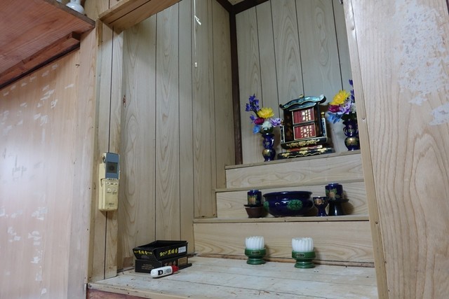 休日の微妙に昼時を外した14時頃に伺うと4組ほど並んでいる。その後ろに並んでいるとスタッフが顔を出して名前と人数を聞いてくれて、20分ほどで店内に案内される。靴を脱いで小上がりにあがると…おっ!仏壇があるじゃないの。おじいおばあの家に来ましたよという雰囲気。メニューはそば大700円、そば小550円、じゅーしー280円というシンプルなもの。