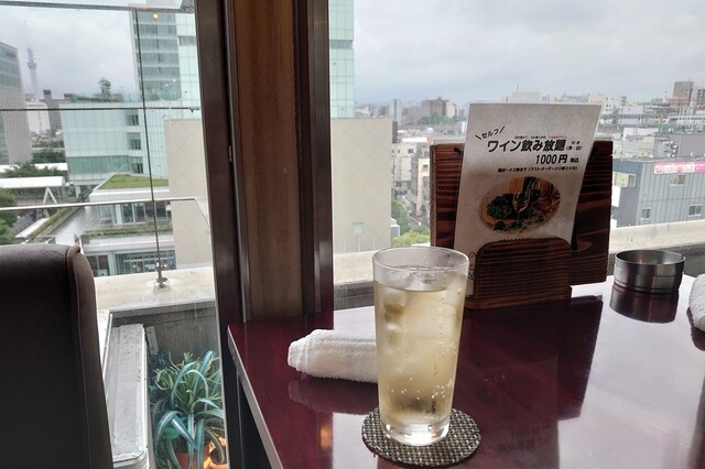 店内はテーブル20席・カウンター6席とベランダに設えたテラス席12席で空いていた。予約名を告げると、テラス席でもOKとのこと。コロナ対策を考えるなら野外というのはベストチョイス。訪問したのは夏だったが、曇りだったので気温も大丈夫。それにしても高層階なので風が気持ちよい。スカイツリーも見えるのもGOOD。
